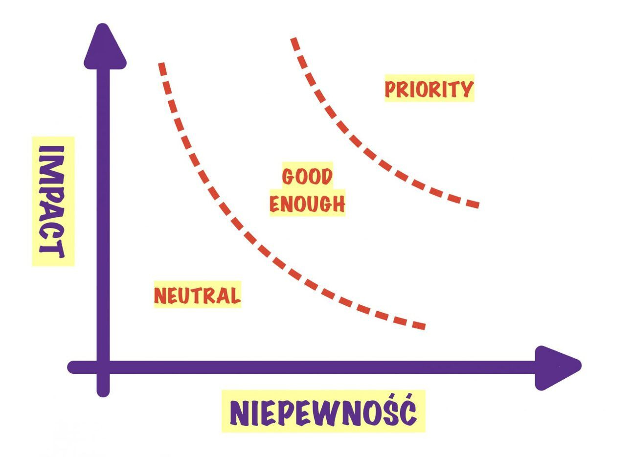 Uświadomienie sobie tego prostego faktu powoduje, że nie popadam w paraliż decyzyjny. Jeśli zrobimy coś źle, po prostu to zmienimy / naprawimy. Jeśli jednak decyzja jest trudno odwracalna i może mieć duży IMPACT – w takim wypadku mówimy sobie wprost, intuicja to za mało. Potrzebujemy lepszego zrozumienia i obniżenia ryzyk produktowych.