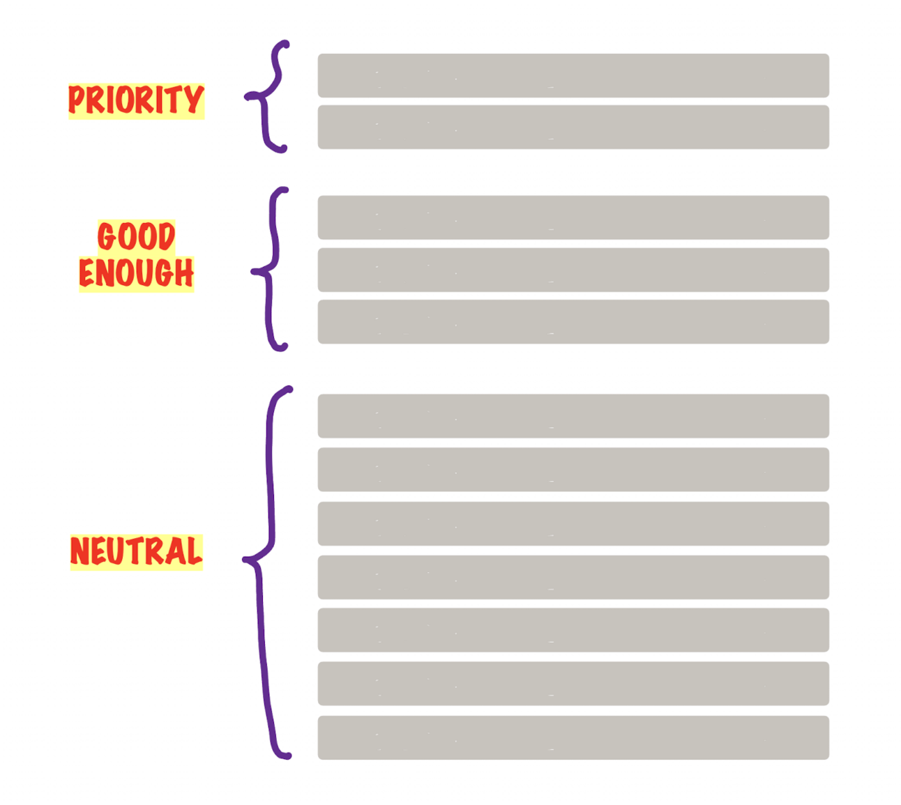 Oczywiście w idealnym świecie dla wszystkich inicjatyw jesteś w stanie robić pełne discovery. Realnie, często tak nie jest (np. kompletny brak designerów/researcherów). Stosuję wtedy regułę 80/20 – czyli 80% discovery przeznaczyliśmy na 20% najważniejszych inicjatyw z roadmapy. I tylko one są tymi „Priority”. Pozostałe 80% inicjatyw z roadmapy ląduje w grupie „Good enogh” i „Neutral”.