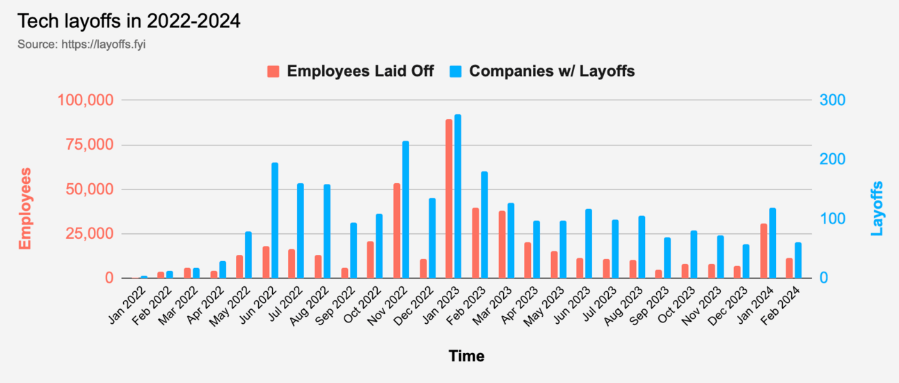 Google zwolniło 13 00 osób (6% załogi), Facebook/Meta pozbyła się ponad 20 000 osób w dwóch dużych rundach, Twitter/X rozstał się z połową pracowników. Szybko rosnące i wysoko wyceniane scaleupy zapowiedziały lub rozpoczęły redukowanie załogi (Stripe, Lift, Bolt).