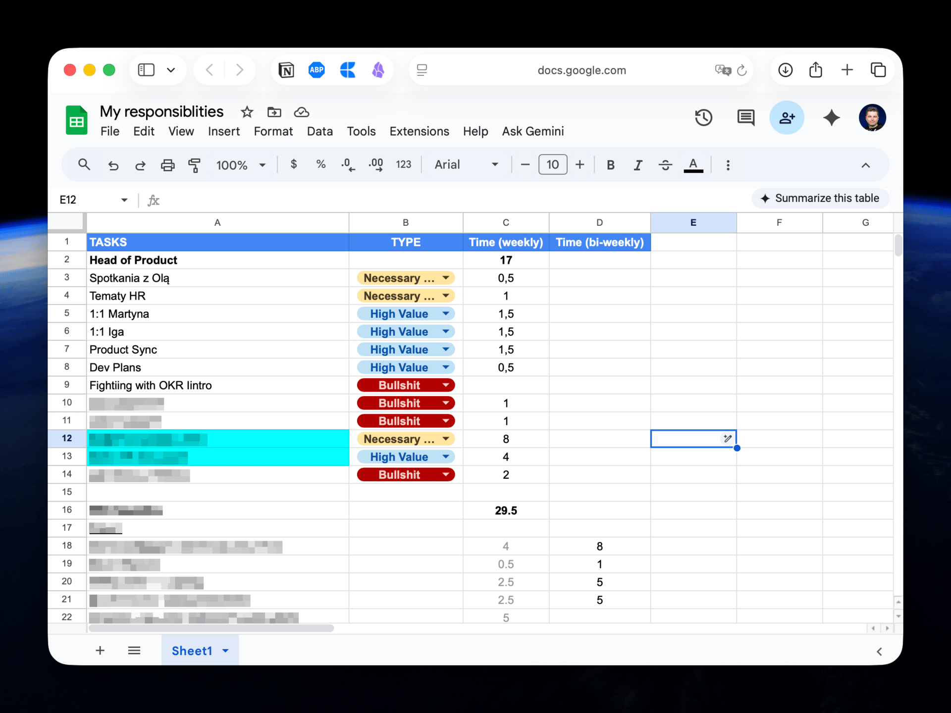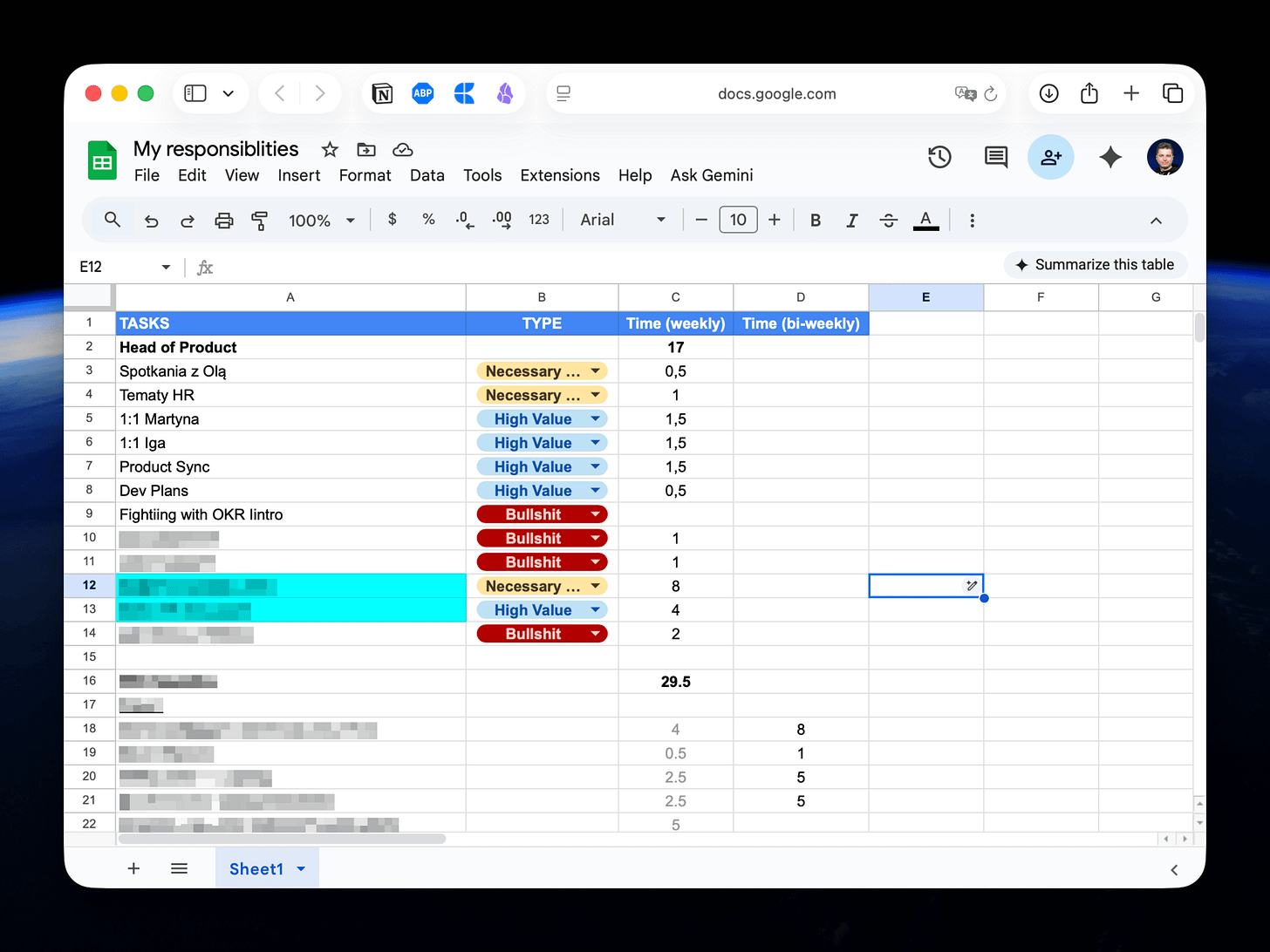 1️⃣ Po prostu spisując moje zadania w spreedsheet z konkretnego tygodnia i potem je klasyfikując. Dla cyklicznych zadań - spisuję też ile czasu na to poświęcam co tydzień / dwa tygodnie.