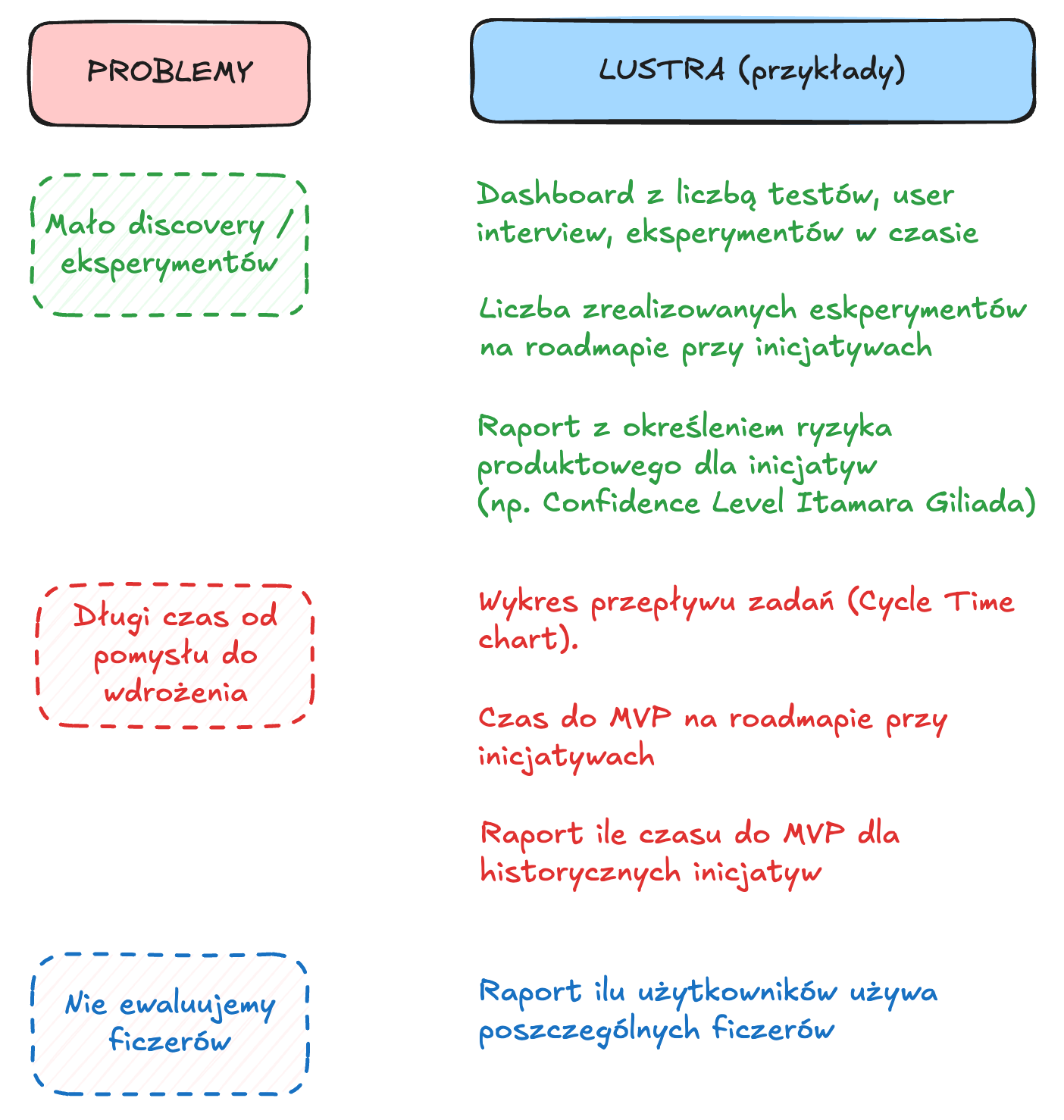 Metodę lustra do wielu sytuacjach i do wielu problemów które zidentyfikowałeś (-aś) w KROK 1. Jedną z pierwszych rzeczy, który często od razy wykrywasz jest to, że nie ewaluujecie swoich inicjatyw / nowych feater’ów.