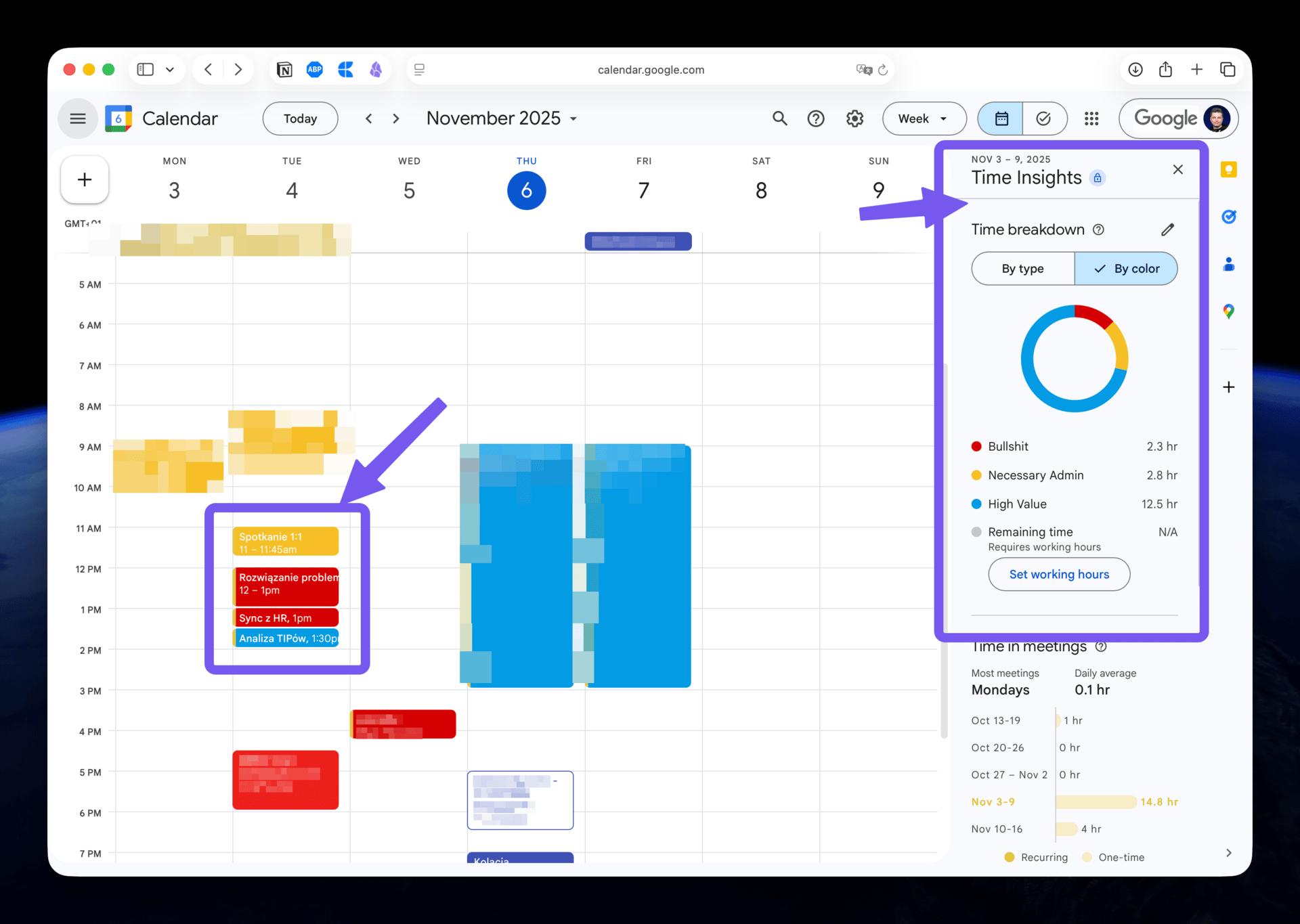 2️⃣ Zapisując swoje wszystkie spotkania, ale też i działania (także indywidualne) w kalendarzu i stosując tzw. color coding - oznaczając każdy blok odpowiednim kolorem oznaczającym jedną z 3 wspomnianych kategorii.