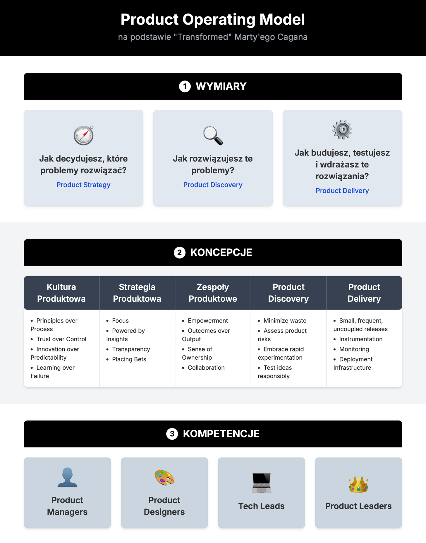 Jeśli chcesz wejść w temat głębiej i bardziej szczegółowo zweryfikować Wasze braki - możesz odwołać się do poszczególnych pryncypiów i zasad „Product Modelu” Model Marty Cagan. Dzięki temu od razu masz “checklistę” tematów którym warto się przyjrzeć: