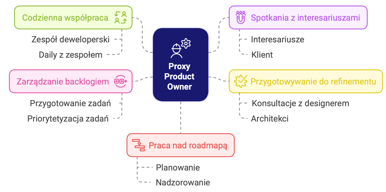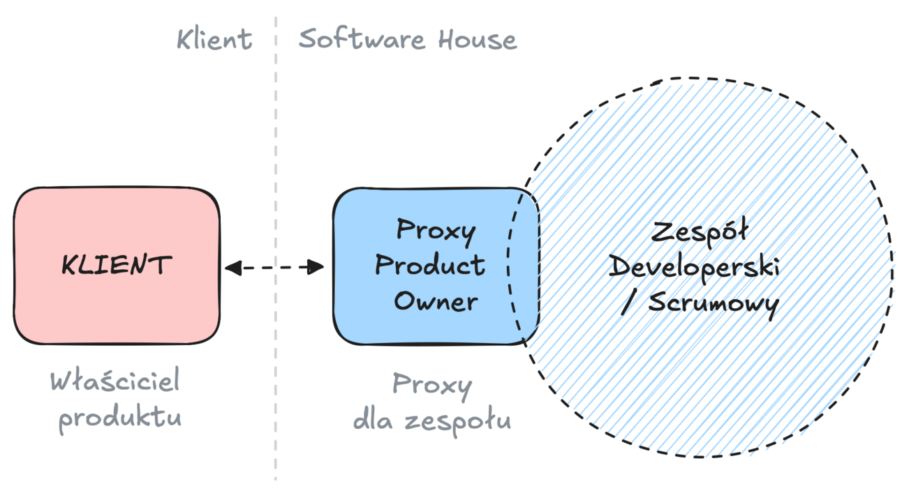 Jako że Właściciel Produktu jest po stronie klienta, w software housach wytworzyła się naturalnie rola Proxy Product Ownera, który jest niejako pośrednikiem między zespołem developerskim dostawcy, a klientem. Klient oczywiście podejmuje finalne decyzje, ale zespół ma dostępnego Proxy PO reprezentującego klienta. Oznacza to, że w jakimś zakresie przejmuje on część obowiązków Product Ownera, szczególnie tych związanych z pracą na rzecz zespołu.