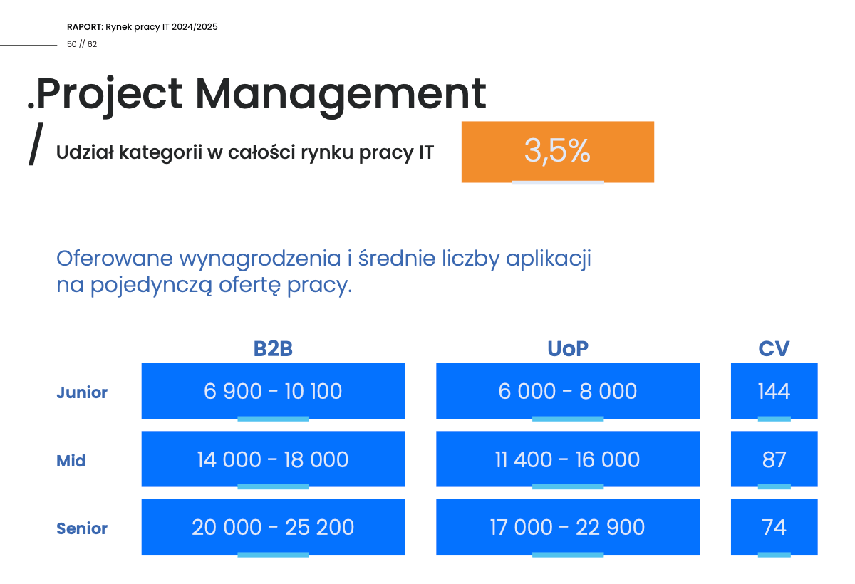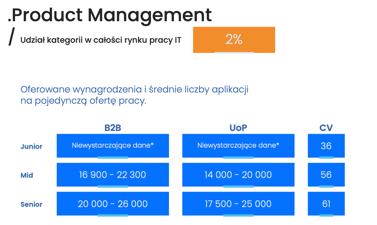 W raporcie „Zarobki produktowców 2021/2022” zarobki product ownerów były o ok. 10-15% niższe niż osób na stanowisku product managera (dotyczy to także wszystkich product ownerów, a nie tylko pracujacych w software hause). Wydaje się to też dobrym przybliżeniem - w takiej sytuacji widełki na poziomie regular byłyby najbardziej zbliżone do roli project managera: 14 - 18 tys. zł. netto na umowie B2B.