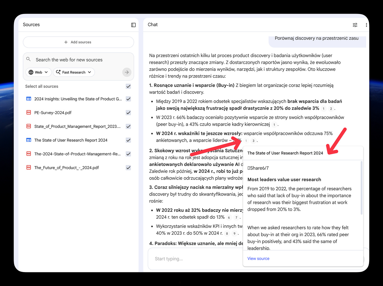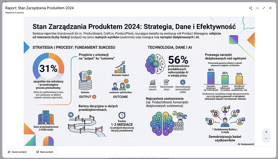 Ja korzystam głównie z czatu (to 90% mojego użycia), ale slide deck i infografika potrafią zaoszczędzić mi godzinę, kiedy muszę szybko przygotować overview z badań dla zarządu.
