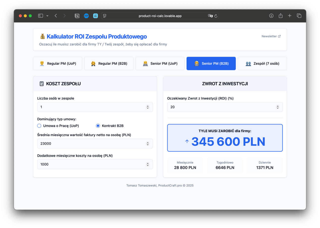 Sprawdź, czy jako Product Manager rzeczywiście „zarabiasz" na swoje niemałe wynagrodzenie - stworzyłem kalkulator, który brutalnie pokazuje liczby.