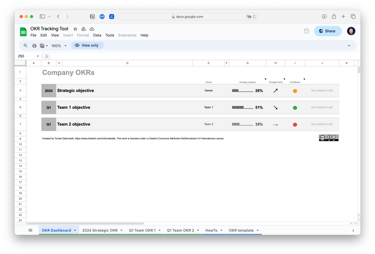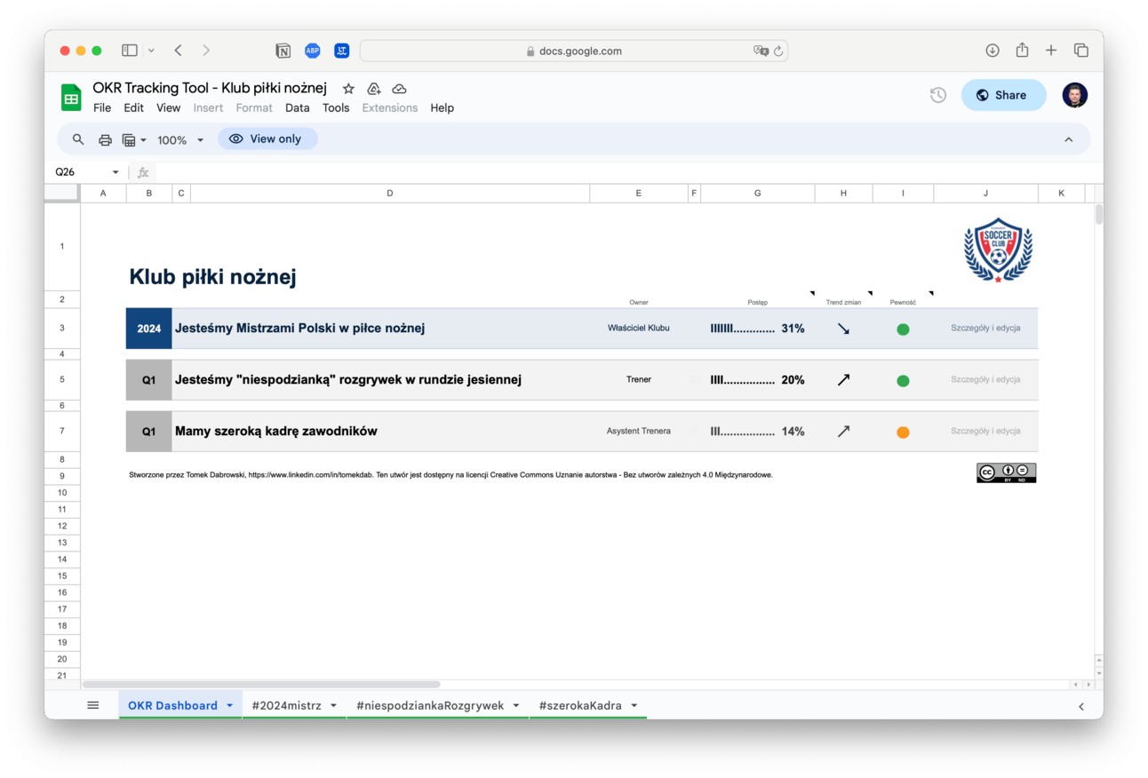 Dlatego zaprosiliśmy do współpracy Tomka Dąbrowskiego (Konsultant oraz trener OKR), który przygotował świetny szablon Google Docs do monitorowania OKRów.