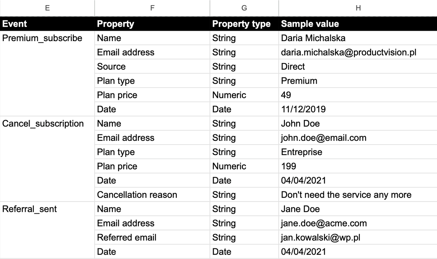 Zaczęliśmy od prostoty: przygotowaliśmy prosty Excel z listą kluczowych eventów (najważniejsze akcje użytkownika + podstawowe parametry). Dla najważniejszych funkcji produktu, bez próby pokrycia wszystkiego. To wystarczyło, by ruszyć i nie ugrzęznąć w „idealnym planie”.