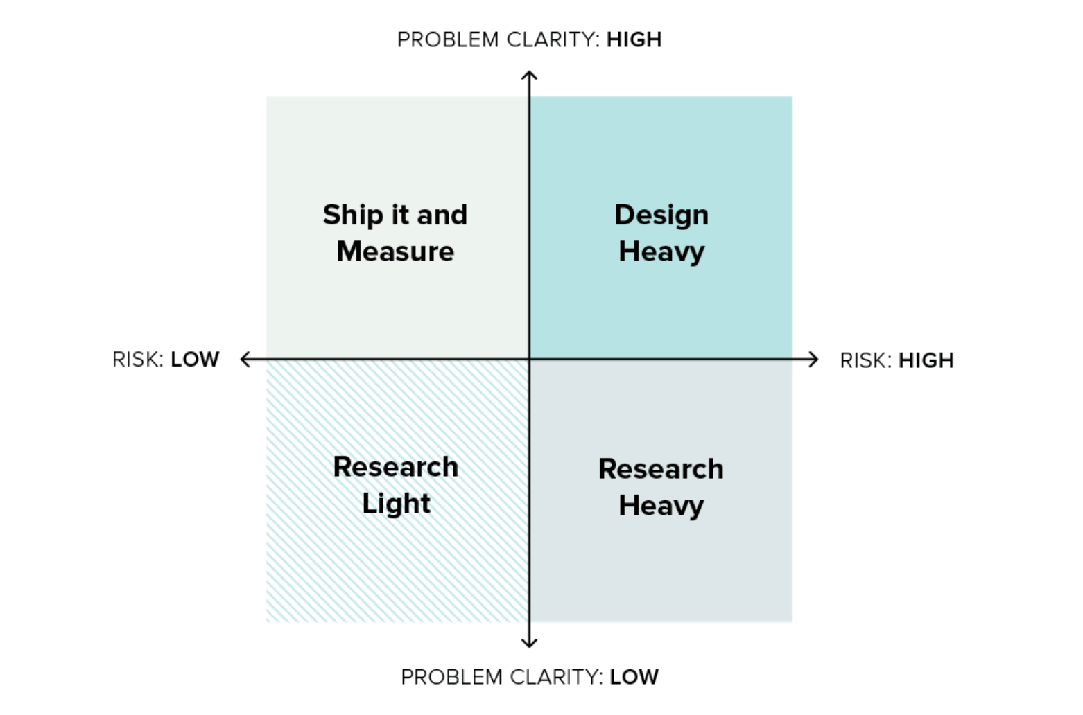 Fajnie to wizualizuje matryca → Zrozumienie problemu vs Ryzyko. Jeśli rozumiemy problem użytkownika + jest niskie ryzyko: wdrażamy małe MVP i mierzymy zachowania (ship-to-learn).