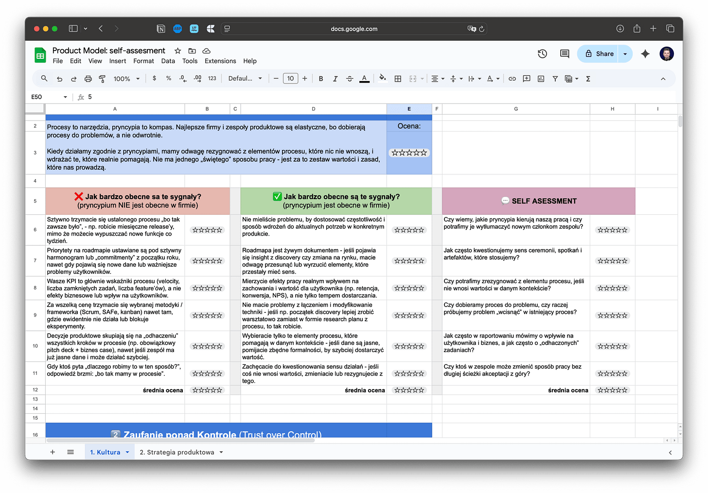 Arkusz będzie rósł wraz z kolejnymi wydaniami newslettera - na dziś obejmuje 3 obszary: Kulturę Produktową, Strategię Produktową i Zespoły Produktowe, a w kolejnych wydaniach będę go rozwijać dalej.