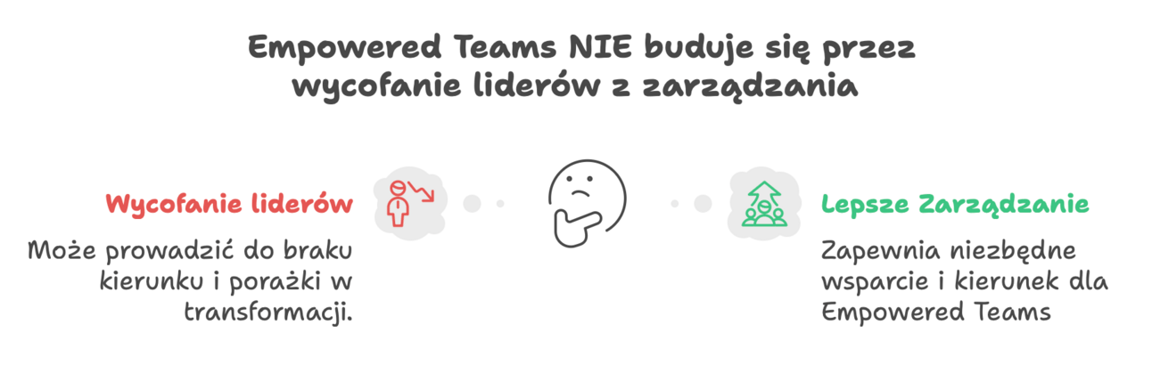 Ludzie gdzieś głęboko w głowie myślą, to szczególnie częsty problem w Europie, że głównym sposobem wzmacniania zespołów jest przekonanie menedżerów, żeby się wycofali. Żeby dali im przestrzeń. Żeby przestali wydawać rozkazy. A ironia polega na tym, że empowered teams nie wymagają mniej zarządzania, one wymagają lepszego zarządzania. I wiele firm ponosi porażkę w swojej transformacji, ponieważ liderzy nie rozumieją kluczowej roli, jaką muszą odegrać.